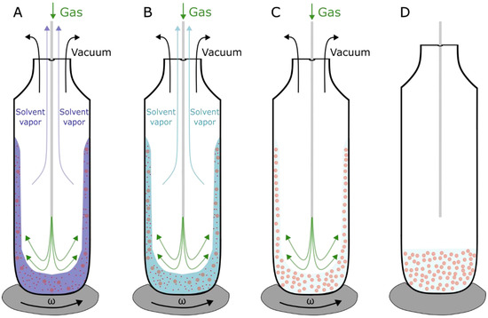 Schematic depiction of the RSE method. (A) Organic solvent (chloroform) (blue) containing lipids (red) is mixed with aqueous solution, and removal of organic solvent is achieved by vortexing the solution under vacuum. The process is made more efficient by adding a flow of inert gas (argon) (green) pushing the organic solvent vapors out. (B) MLVs start to form. The vacuum pressure is set below the organic solvent evaporation point but higher than the evaporation point of water. (C) Exchange is finished when all the organic solution is evaporated and only aqueous solution containing formed MLVs is left. (D) When MLVs are formed, vortex is turned off, and vacuum and gas flow pipes are closed. As reported in [40], the whole process takes less than a minute.