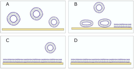 Different methods can be used for the formation of SLBs. The most widely used method today is vesicle fusion, pioneered by McConnell et al. (Figure 7). The method involves spreading SUVs or LUVs on a hydrophilic surface and their subsequent rupturing in order to form an SLB [62]. It is a fast and easy method but depends on different aspects, such as the vesicle size (a smaller size leads to easier vesicle rupturing), lipid composition (charge of lipids, Chol concentration and saturation degree of the lipids), temperature, the type of substrate and ionic strength [61,63,64,65]. Plasma treatment is most commonly used for surface hydrophilization to promote the rupture of vesicles. Vesicles are adsorbed onto the surface until a critical concentration is achieved, after which the vesicle rupture occurs. Around 1 h is needed for this process to occur [66]. Lipids are then reorganized into a bilayer that is separated from the surface by a thin layer of water. The sample is washed with a buffer to remove unadsorbed vesicles.