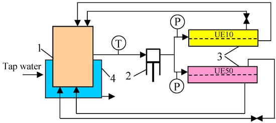 UF installation with two plate modules. 1—feed tank, 2—pump, 3—module, 4—water cooling, T—thermometer, P—manometer.