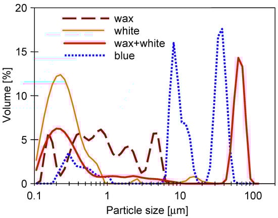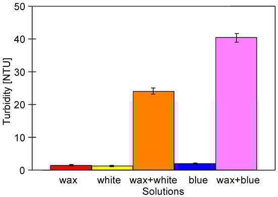 Analysis of the particles’ size distribution has shown that the increase in the mixture’s turbidity was caused by the increase in the number of larger particles. For instance, the white agent solution contained mainly particles below 1 μm, while the wax solution was characterized mostly by particles below 6 μm. However, in a mixture of these agents, particles over 50 μm were present (Figure 3). Worthy of note, the solution of the blue agent contained much larger particles than its white counterpart, which contained no dye.