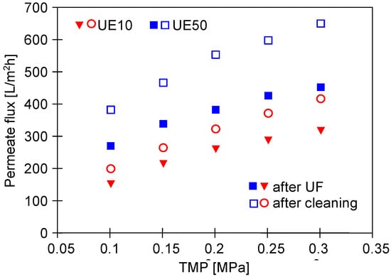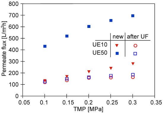 The water permeability for the new UE10 and UE50 membranes is shown in Figure 4. Importantly, nearly three times higher permeate flux was noted for the UE50 membranes. Indeed, for instance, at a TMP of 2 MPa, the water flux was equal to 600 L/m2h and 208 L/m2h for the UE50 and UE10 membranes, respectively. Undeniably, this observation is related to the fact that UE50 membranes are characterized by a 10-times higher value of MWCO compared to UE10 membranes (Table 1).
