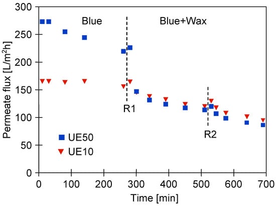 Changes in the permeate flux during cleaning membranes contaminated with components of the blue + wax solution are shown in Figure 7. In the first stage, the membranes were rinsed with the NF permeate, and then, the modules were immersed in water (osmotic rinsing) for 12 h (points R1 and R2). As a result, the permeate flux of the UE10 membrane increased to 185 L/m2h, which was similar to the initial value reported (Figure 4). However, such an effect was not obtained for the UE50 membrane, which confirmed that its pores were significantly blocked. Subsequently, the filtration of the green solution (0.5%) was performed for 90 min, which allowed us to obtain a slight increase in the permeate flux, especially for the UE50 membrane. This finding indicated that the flow of the green solution through the membrane could dissolve the wax present in its pores. After flushing the installation with the NF permeate, the maximum flux for UE10 and UE50 membranes was equal to 200 L/m2h and 214 L/m2h, respectively. Hence, it can be concluded that the initial performance of the UE10 membrane was restored, while the flux of the UE50 membrane was still significantly lower than that reported for the virgin membrane (Figure 4). In addition, it was observed during the experimental investigation that restarting the separation process of the blue + wax solution led to the reduction in the permeate flux to the level reported before the membrane cleaning (Figure 6, after 100 min) within 60 min.
