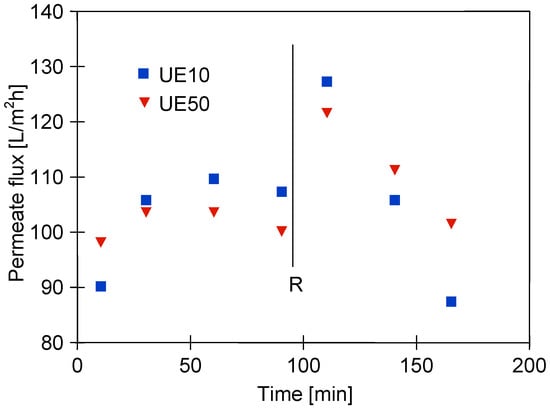In the literature, there is general agreement that the formation of deposits on the membrane surface and the thickness of the gel layer depends on the feed flow rate [60,61]. In the present study, after completing the tests presented in Figure 5, the feed flow velocity was increased from 0.6 to 1 m/s, which significantly increased the permeate flux (Figure 6, first 100 h). This result confirmed that increasing the turbulence of the flow decreases the polarized layer thickness, and consequently, the amount of deposit formed on the membrane’s surface was reduced [25]. However, the permeate flux obtained for the UE50 membrane was still almost two times lower than the initial value presented in Figure 5. It is worth mentioning that this finding is in accordance with the results presented in [25], wherein the treatment of carwash wastewater by MF and UF membranes has been investigated. In the above-mentioned study, it was shown that the increase in flow rate from 0.5 to 1.5 L/min led to an increase in the performance of hollow fiber polyetherimide membrane with a mean pore diameter of 0.4 μm.
