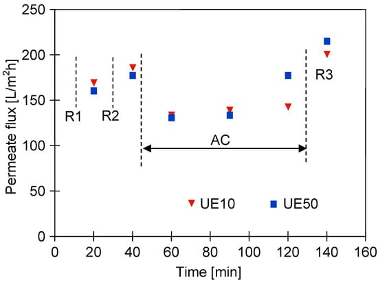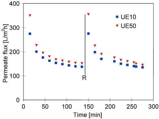 After completing the measurement series presented in Figure 12, the time of membranes rinsing with the green solution was increased from 30 to 60 min (Figure 13). It has been found that it allowed us to recover the values of maximum flux to 183 L/m2h and 225 L/m2h for the UE10 and UE50 membranes, respectively (Figure 13, point R1). However, the recorded flux values after repeated concentration runs systematically decreased, which indicates that the intensity of the fouling increased. Undoubtedly, the extension of the cleaning procedure time ensured more effective cleaning of the UE50 membrane’s surface. Indeed, finally, the permeate flux for this membrane was slightly higher than that obtained for the UE10 membranes. Worthy of note, analysis performed with the application of Hermia’s model showed that during each stage of the above-mentioned measurements series (Figure 12 and Figure 13), the cake layer was the main reason for the flux decline for two membranes tested (Table A4 and Table A5, Appendix A).