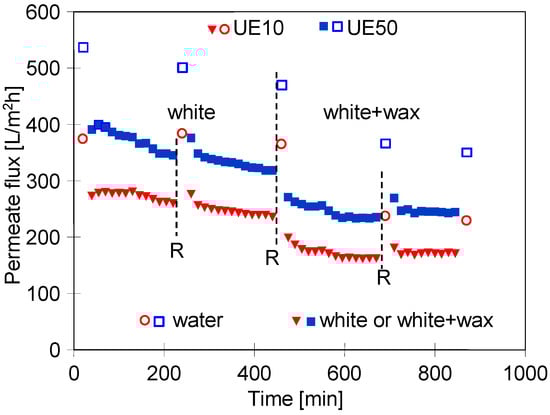 Different results in terms of process performance obtained for blue and green agents indicated that the type of cleaning agent used as a feed has a significant impact on the fouling intensity. In other studies [43,62], a decrease in the permeate flux in the range of 20–80% was reported, depending on the surfactant type. To confirm the above, in the next measurement series, the UF experiments were carried out using as a feed the white + wax mixture, which was characterized by two times lower turbidity compared to the blue + wax one (Figure 2). As expected, the addition of wax to the surfactant solution significantly reduced the permeate flux (Figure 8, from 450 h). However, the decline in the process performance was much lower than that observed during the UF process of the blue + wax mixture (Figure 5). Moreover, it has been found that the permeate flux for the UE50 membrane decreased only twice compared to the initial value and was much higher than that noted for the UE10 membrane. Between the measurement series, the membranes were rinsed with water, and changes in the maximum flux (points R) were measured. It has been found that after feeding the modules with the white + wax mixture, the flux decreased; however, it quickly stabilized at the levels of 350 L/m2h and 230 L/m2h for UE50 UE10 membranes, respectively. To be complete, it should be indicated that fitting the experimental data to Hermia’s model indicated that during each stage of the process run, the formation of a cake layer was the dominant fouling mechanism for both membranes used (Table A2, Appendix A). Rinsing the membranes with sodium hydroxide (NaOH) solution (0.5 g/L) for 2 h allowed us to obtain a flux similar to the initial values noted for the clean membranes (Figure 9). It can be explained by the fact that NaOH solution hydrolyses surfactant molecules, which leads to a decrease in emulsion stability and, consequently, facilitates their removal from the membrane surface [43,62,63,64]. Hence, it can be concluded that the results obtained in the present study are in complete agreement with those presented in the literature. Indeed, NaOH solutions have been successfully used for cleaning UF membranes fouled with different types of wastewater, for instance, oily waste [65] and dairy wastewater [66].