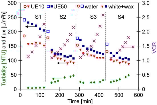 Changes in the feed turbidity, permeate flux and VCR during the UF process with continuous permeate collection. S1–S4—measurement series. Feed: S1—wax (0.2%) + white (0.5%), S2–S4: white (0.5%) + wax (0.2%). Feed flow rate: 1 m/s. Water—permeate flux after rinsing the membranes with water.