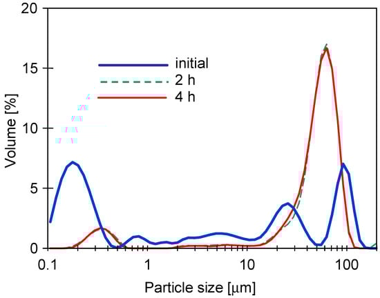 In the subsequent experimental series, the process was investigated with the white wax mixture used as a feed, which was characterized by higher turbidity (23–24 NTU). Performing the UF process of the feed characterized by higher turbidity resulted in a greater decrease in permeate flux during the initial 60 min, after which the flux stabilized (Figure 10 (S2–S4)). Analysis of the particle size distribution performed during the concentration of the white + wax mixture demonstrated that the particles dispersed in the feed increased in size during the process (Figure 11). Interestingly, despite the continuous increase in the feed concentration, the particle size distribution after 2 and 4 h of the process run was similar. This noteworthy result indicated that particles agglomeration in the installation occurred rapidly (e.g., due to an increase in the pressure and mixing—mutual collisions), and the amount of suspended matter stabilized during the UF, most likely as a result of the particles settling on the membranes surface and the installation walls.