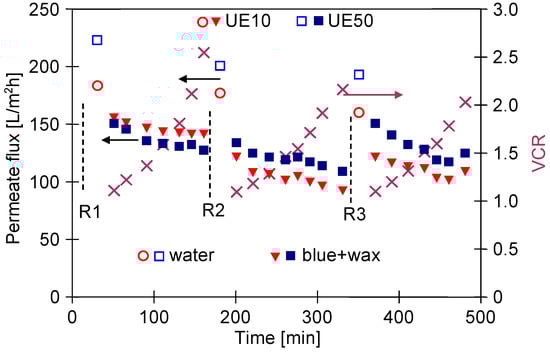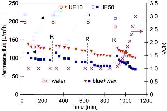 Changes in the permeate flux and VCR during the UF process. Feed: the blue + wax mixture, periodic rinsing (30 min) with green solution (points R). The continuous permeate collection from 900 min.