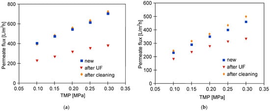 Impact of the TMP on the maximum permeate flux for the membranes after separation of the real wastewaters and after membranes cleaning with NaOH solution (1 g/L) for 2 h. (a) UE50, (b) UE10.