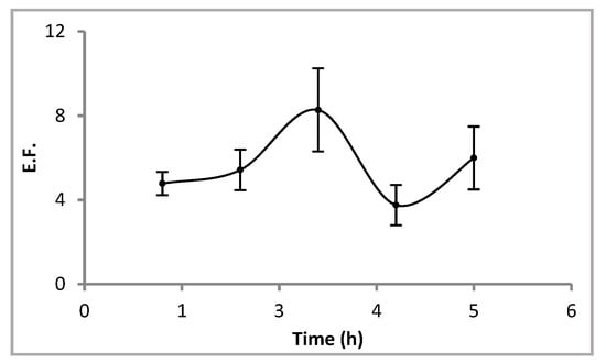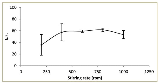 The stirring rate is an important factor in HFLPME because the agitation of the sample improves the mass transfer of the analyte and also reaches the equilibrium between the sample solution and the liquid membrane quickly. In the proposed method, it was evaluated between 200–1000 rpm. The results are shown in Figure 6. An increase in the EF was obtained with increasing stirring rate up to 600–800 rpm. The higher rate assayed obtained a decrease in the EF and poorer reproducibility. In these experiments, formation of air bubbles in the surface of the fibres was observed, which has been related to a reduction in the contact area between the sample and the liquid membrane negatively affecting the extraction efficacy []. Thus, 600 rpm was selected as the optimum stirring rate for the following experiments.