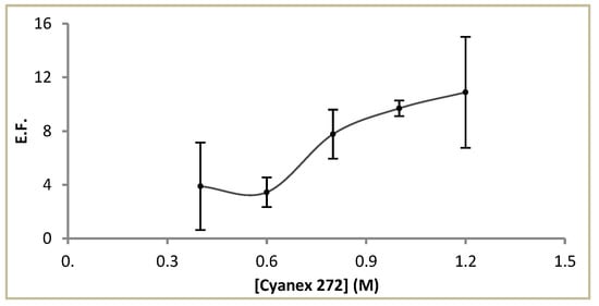 The results obtained when Cyanex® 272 concentration was varied from 0.4 M to 1.2 M showed an improvement in the EF up to the higher concentration assayed (Figure 4). However, at this concentration, a higher irreproducibility was observed in the results, probably due to instability of the liquid membrane in the pores of the hollow fibres. This instability was confirmed by the presence of organic droplets in the sample, and is an intrinsic characteristic of supported liquid membranes due to retention of polymeric fibre in the organic phase in the pores by capillary forces []. Thus, Cyanex® 272 1 M was selected as the liquid membrane concentration for further experiments.