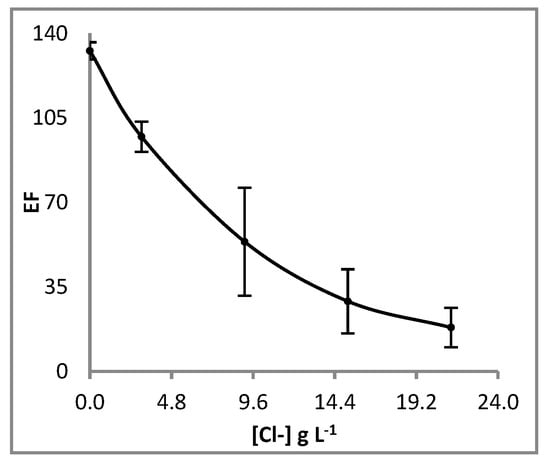 Thus, from the results reported above, we obtained a linear relationship between the logarithm of enrichment factor and Cl− concentration (in g L−1) in the samples as follows (Equation (3)):