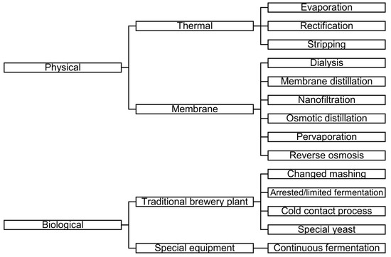 The aim of LAB or AFB production is to reduce the ethanol content of beer while maintaining other characteristics [2]. There are different methods for LAB or AFB production. Figure 1 shows the schemes of LAB and AFB production methods (based on [3,5,6,7,8]).
