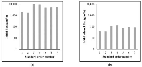 Hydrodynamic parameters of the separations: (a) initial flux (log); (b) initial ethanol flux (log).