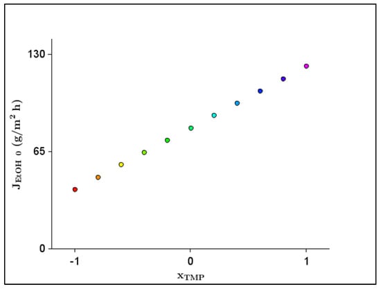 The optimal value of the factor amounted to TMP = 30 bar, considering the ethanol flux. The predicted under the above condition was 121.965 g/m2 h. Therefore, the highest could be achieved with the highest TMP.