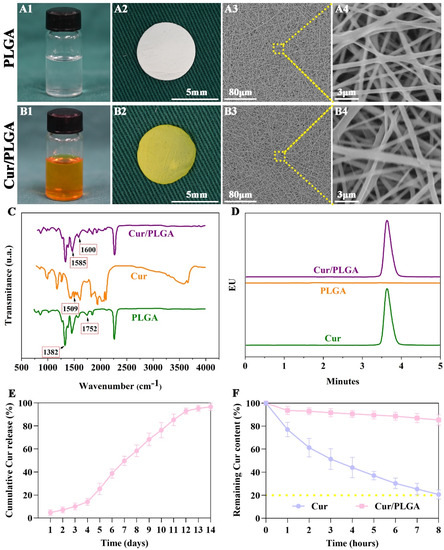 Figure 1. Synthesis and characterization of the poly(lactic−co−glycolic acid) (PLGA) and curcumin/PLGA (Cur/PLGA) nanofibrous membranes: Images of spinning solutions of the PLGA (A1) and Cur/PLGA (B1) groups. Images of fabricated nanofibrous membranes of the PLGA (A2) and Cur/PLGA (B2) groups. Scanning electron micrographs of nanofibrous membranes of the PLGA (A3,A4) and Cur/PLGA (B3,B4) groups. Fourier−transform infrared (FTIR) spectra (C) and high−performance liquid chromatography chromatograms (D) of Cur, PLGA, and Cur/PLGA samples. Curve representing the cumulative release of Cur from the Cur/PLGA nanofibrous membrane (E). Remaining Cur content in the pure Cur and Cur/PLGA groups after incubation with phosphate−buffered saline (PBS) (37 °C, pH 7.4) for 8 h (F).