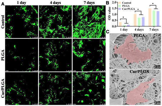 Figure 2. In vitro cytocompatibility of the curcumin/poly(lactic-co-glycolic acid) (Cur/PLGA) nanofibrous membrane: Live/dead staining (A) and optical density (OD) values, which were determined using the cell counting kit (CCK)-8 assay (B), of chondrocytes seeded onto the Petri dish (control), PLGA, and Cur/PLGA nanofibrous membranes for 1–7 days. Scanning electron microscopy analysis of RAW264.7 macrophages seeded onto the PLGA and Cur/PLGA nanofibrous membranes for 24 h (C). The red color indicates the RAW264.7 macrophages. * p < 0.05.