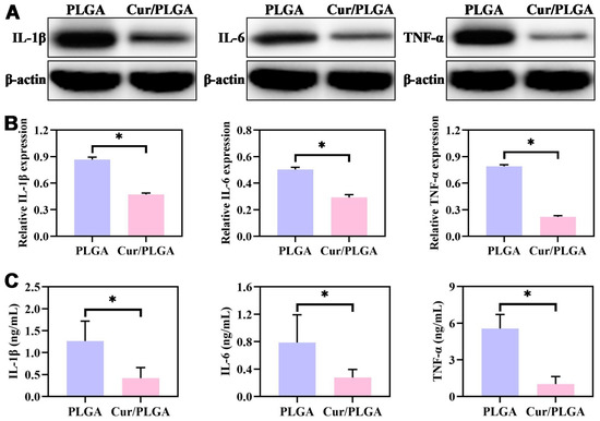 Figure 3. In vitro anti-inflammatory activities of the curcumin/poly(lactic-co-glycolic acid) (Cur/PLGA) nanofibrous membrane: The expression levels of IL-1β, IL-6, and TNF-α in the PLGA and Cur/PLGA nanofibrous membranes incubated with RAW264.7 macrophages for 24 h were determined using Western blotting (A). The quantification of the expression levels of IL-1β, IL-6, and TNF-α in the PLGA and Cur/PLGA groups from the blots (B). The expression levels of IL-1β, IL-6, and TNF-α in the PLGA and Cur/PLGA nanofibrous membranes incubated with RAW264.7 macrophages for 24 h were also examined using an enzyme-linked immunosorbent assay (C). * p < 0.05.