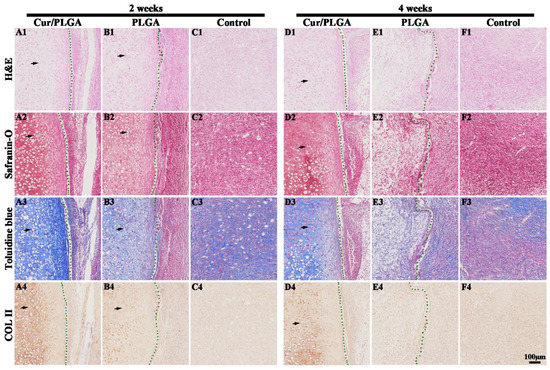 Figure 6. Histological evaluation of the nanofibrous-membrane-packaged cartilage tissue at weeks 2 and 4 after subcutaneous implantation in rats: Hematoxylin and eosin (H&E) staining of samples in the curcumin/poly(lactic-co-glycolic acid) (Cur/PLGA), PLGA, and control groups (A1F1). Safranin-O staining of samples in the Cur/PLGA, PLGA, and control groups (A2F2). Toluidine blue staining of samples in the Cur/PLGA, PLGA, and control groups (A3F3). COL II immunohistochemical staining of samples in the Cur/PLGA, PLGA, and control groups (A4F4). The black arrows indicate the cartilage-specific extracellular matrix (ECM). The dotted green lines outline the nanofibrous membrane, while the remaining region represents the cartilage.