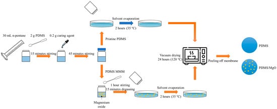 PDMSs (Sylgard-184) were procured from Dow Corning (USA). They consist of two components: elastomer and curing agent. In accordance with the recommendation by the manufacturer, the elastomer and curing agent were mixed at the ratio of 10:1 for membrane fabrication. The n-pentane (>96 wt% purity) was purchased from Merck (Germany) was used as the solvent for membrane fabrication. Sodium hydrogen carbonate, NaHCO3, and magnesium chloride, MgCl2 (anhydrous) precursors, were purchased from Merck (Germany) for the fabrication of magnesium oxide nanosheets. Ethanol, C2H5OH (99.5 wt% purity), was purchased from Merck (Germany). All materials procured were used as received without further purification.