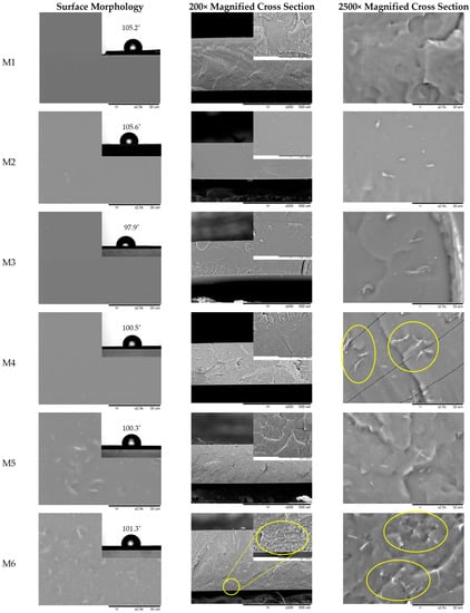 Surface and cross-sectional morphology of PDMS and PDMS/MgO membranes at various loading. The inset of the surface morphology shows the water CA obtained from five average values. The inset in cross-sectional area of M6 shows the sedimentation of MgO nanosheet at the bottom of the membrane matrix.