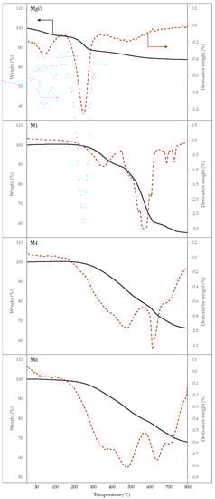 The thermal stability of PDMS and PDMS/MgO membranes was studied by analysing the thermal decomposition of the membrane with TGA and DTG curves, as shown in Figure 5. For MgO nanosheet powder, the temperature loss at the 200 °C to 300 °C region could be ascribed to the loss of the water moisture that may have physically or chemically adsorbed on the surface of the MgO nanosheet powder upon long storage [69,70]. For pristine PDMS membranes, the first on-set temperature ranged from approximately 300 °C to 400 °C, which is due to the typical loss of water moisture and physical adsorbed layer [71] as well as removal of lateral groups from the main chain of PDMS, while the mass reduction from around 450 to 600 is ascribed to the breakdown of the PDMS chain [48]. The weight loss for M4 and M6 was less than that of M1 based on the TGA and DTG curves in Figure 5. The final residues remaining on M1, M4, and M6 were 55%, 66%, and 68%, respectively. This could be ascribed to the amount of MgO nanosheet filler present in each membrane, whereby M6 had the highest MgO nanosheet loading, contributing to more residual mass compared to M4 and M1. The initial thermal decomposition of PDMS/MgO MMM 393 shifted to 501 °C for both M4 and M6 as compared to the pristine M1 membrane, which could be ascribed to the disruption of the polymeric matrix by the MgO nanosheet lowering the polymer chain’s mobility [72]. The thermal stability between M4 and M6 does not differ significantly, albeit the MgO nanosheet content in M6 is about five times higher than in M4. Both M4 and M6 exhibited almost similar TGA curves. However, based on the DTG curves, M4 showed a slightly higher rate of mass loss at 509 °C (−0.964%) and 635 °C (−1.25%) as compared to the rate of mass loss for M6 at 512 °C (0.818%) and 659 °C (−0.752). Hence, the improvement of thermal stability of the membrane with MgO nanosheet loading beyond 1 wt.% was not significant. Therefore, it can be concluded that the presence of the MgO nanosheet inside the PDMS matrix enhanced the thermal stability of the membrane. The MgO nanosheet prevented volatile movement of volatiles during thermal treatment. When the samples were further heated, M1 showed significant mass loss when the temperature was approximately 598 °C. Meanwhile, for M4 and M6, the second thermal decomposition shifted to 636 °C and 656 °C, respectively. Lastly, the increase in mass residue of the samples could be attributed to the presence of inorganic MgO nanosheet filler that sustains even at high temperature.
