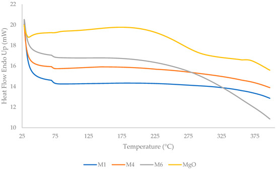 DSC was performed onto the synthesized MgO powder, PDMS, and PDMS/MgO nanosheet composite membrane with temperatures ranging from 25 °C to 400 °C and is represented in Figure 6. For the MgO nanosheet powder, the broad endothermal peak in the range between 175 °C and 300 °C was due to the loss of water moisture [66] as confirmed by the DTG thermogram in Figure 5. Meanwhile, the first thermal transition was observed at the region between 60 °C and 75 °C for M1, M4, and M6. The transitional temperature did not differ much between M1, M4, and M6, but the heat flow value increased with increasing MgO nanosheet content in the PDMS membrane. Suleman et al. [73] also reported nearly similar first-transition temperatures in their studies. Additionally, the endothermic peaks of M1, M4, and M6 in the range between 375 °C and 400 °C were due to the loss of water moisture and physical adsorbed layer from the membranes, as discussed in Figure 5. There is no distinctive glass transition temperature (Tg) observed in Figure 6. Moreover, PDMS is one of the rubbery polymers that has the lowest Tg (~−123 °C) [74].