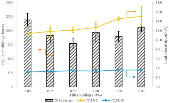 Lastly, when the filler was further increased to 5 wt.%, the gas permeability increased to 2104 Barrer. The gas separation performance concurred with the inset of the cross-sectional SEM image of M6 in Figure 3, where there is sedimentation of the MgO nanosheet at the bottom of the MMM following its complete phase separation. The deposition of the MgO nanosheet at the bottom of the PDMS membrane matrix may have created nonselective voids in the membrane matrix that promoted the increment of CO2 permeability. Regardless, it can be observed from Figure 7 that the CO2/N2 ideal selectivity does not drop, while CO2/CH4 ideal selectivity remained relatively constant. Although sedimentation of the fillers was observed, since the fabricated membrane was fully dense, the interfacial voids formed at the sedimented filler section at the bottom of the membrane matrix did not impede ideal selectivity, as there was still a large, dense selective layer with a distributed MgO nanosheet on the top part of the membrane matrix. As such, it is inferred that the filler sediment provided a low resistance diffusional pathway due to interfacial void formation, while the top layer provided a selective diffusional pathway akin to an asymmetric membrane. However, the CO2/N2 ideal selectivity also showed the highest error bar due to lower reproducibility.