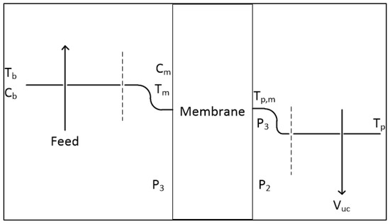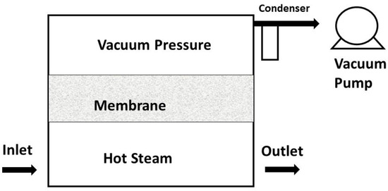 Among the types of MD processes discussed, VMD is considered to be an appealing and cost-effective membrane separation process [13]. It provides a higher-pressure gradient than other MD methods, with low operating pressures [14]. One side of the membrane is vacuumed, and the other side is kept slightly below the saturation pressure, which helps in the filtration process [15,16]. In a VMD process, heat and mass transfer processes occur concurrently. The system consists of the bulk feed solution, the feed boundary layer (next to the membrane), the membrane, permeate boundary layer, and the permeate bulk area as indicated in Figure 1, and the general process diagram of VMD is shown in Figure 2.