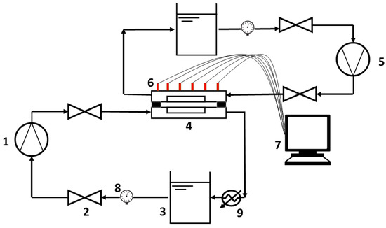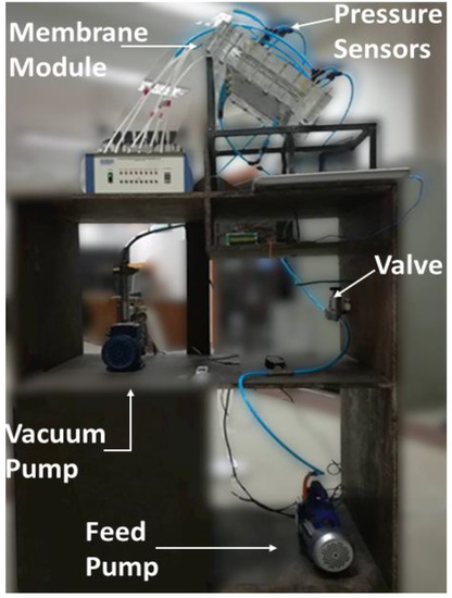 The experimental setup consists of two pumps, one feedwater, one vacuum pump (Hyundai Vacuum Pump 0.5 Hp, HCPSP0.5-1 × 1IN), a VMD membrane module, Control Valves, Pressure sensors, and water storage tanks. The details of these are given in Figure 3 and Figure 4. The VMD module in Figure 3 is connected to a computer for data acquisition, where pressure data is being communicated from multiple probes as indicated between module 4 and 7 in the figure.