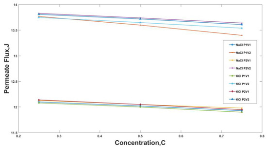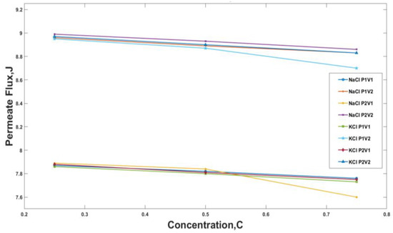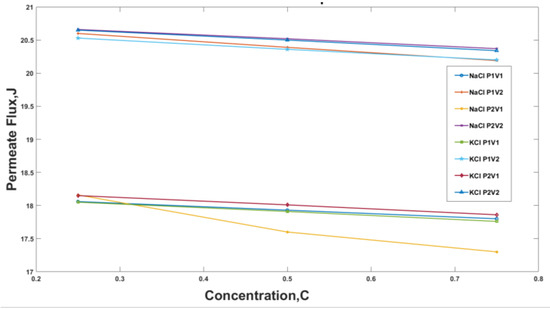 The permeate flux for the NaCl and the KCl solution at a temperature of 70 °C has been plotted in Figure 7. Similar to the above plots, it was noted that the increase in the concentration of salt in the solution decreases the permeate flux. For the NaCl solution, a decrease in permeate of 12.6% was observed for a constant velocity of 3.48 m/s and an increase in pressure from 30 kPa to 20 kPa. Additionally, it was observed that at constant pressure 30 kPa or 20 kPa and increase in velocity from 3.48 m/s to 5.22 m/s the permeate flux increased. The graphs trend for the KCl Solution were comparable to NaCl with a difference of a single case, i.e., 20 kPa, 3.48 m/s. The decrease in permeate flux for KCl for parameters 20 kPa, 3.48 m/s was linear while that of the NaCl solution was nonlinear.