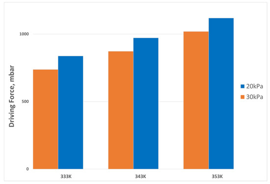 The process driving force, being a critical parameter in VMD, was calculated for different temperature and pressure values using Equation (1). The results are presented in a bar graph in Figure 8. The minimum driving force was observed at a temperature of 333 K and a pressure of 30 kPa, while the highest driving force was observed at a temperature of 353 K and a pressure of 20 kPa. The driving force effects the efficiency and productivity in VMD process. A higher driving force leads to faster separation rates and increased productivity, while a lower driving force reduces efficiency and productivity. The study’s findings on the relationship between driving force and temperature/pressure conditions have important implications for optimizing VMD processes. By selecting optimal operating conditions, the efficiency and productivity of VMD processes can be improved, making it useful in various separation processes such as desalination and wastewater treatment.