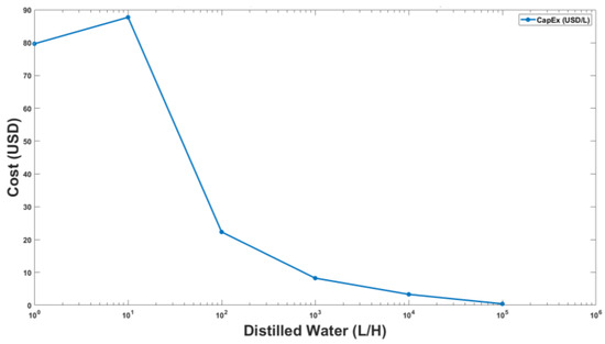 For the lab scale model, the total cost incurred is described in Table 3. Since technical support and instrumentation were available in the lab, the installation and instrumentation costs of the unit is taken as 25% of the cost of the lab scale vacuum membrane distillation plant as recommended in the literature [36]. The maximum and minimum permeate flux for NaCl solution was recorded as 20.37 and 7.87 L/m2.H and, for KCl, as 7.73 and 20.65 L/m2.H, respectively, where the duration of the experiment was in hours. To determine the costs of the larger scale units capable of producing greater permeate flux, a market survey was conducted to estimate the prices for essential components, i.e., feed water pump and vacuum pump for the vacuum membrane distillation unit at different scales from a few liters of permeate flux to 100,000 Liters/hour. Installation and commissioning cost of the distillation unit along with the miscellaneous cost was calculated. While estimating the price, researchers [37] have considered 25% of total plant cost as installation cost, while, in this research, a nonlinear cost function for installation was considered that is inversely proportional to the size of the plant such that the smallest units have 60%, whereas 20% for the largest unit is considered. The capital cost for various capacities of vacuum membrane distillation plants obtained is shown in Figure 9.