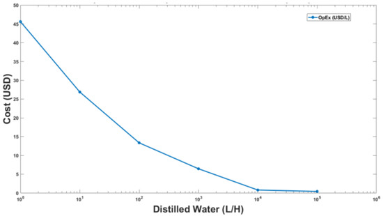 The capital and operating expenses for the upscaled distillation plant were calculated in USD/L by considering the optimal power consumption of a feed water pump and vacuum pump along with nominal electricity charges and are shown in Figure 10. The nominal electricity charges were taken from the local electricity provider [37]. The optimal power consumption was calculated by using the rated power of the pumps with their operating hours in a day. Miscellaneous plant operating and maintenance costs were also considered as a range of 10% to 22% of base operating cost in proportion to the scale of the plant.