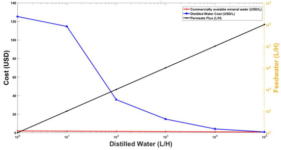 The suggested desalination model achieves its breakeven point against the commercially available mineral water when distilled water production of 100,000 L/H is shown in Figure 11. Figure 11 takes into account both capital and operational expenses and feed water flow rate required to produce varying quantities of distilled water. At lab scale, the unit cost of distilled water is very high, which can be brought down significantly after increasing production volume. The graph indicates a breakeven for distilled water production from a larger version of the lab scale VMD unit at a production capacity of 100,000 L per hour. To achieve this rate of permeate flux in the VMD Plant, it will be taking in approximately 100 million liters of sea water per hour as indicated by the black line in Figure 10 above.