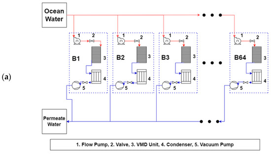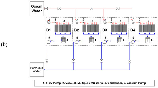 Proposed layout of VMD plants range of integration: (a) 64 VMD units and (b) 4 multi-effect vacuum membrane units.