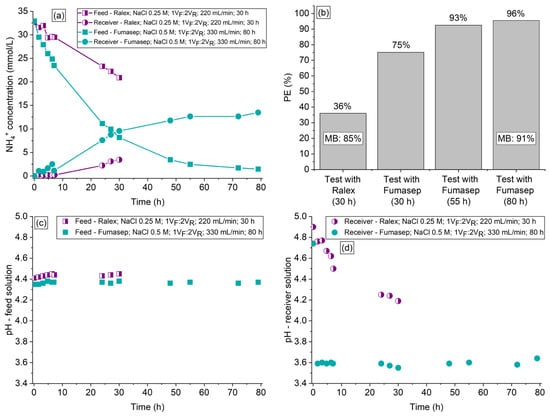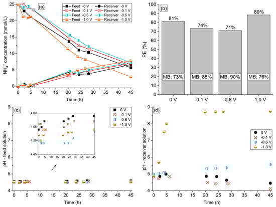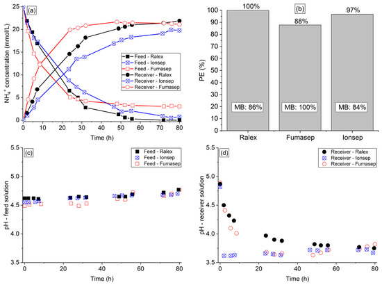 The organic acids and phosphate ions remained in the feed solution. The results of ammonium concentration in both compartments are shown in Figure 3a, whereas the results of NH4+ percent extraction and final mass balance are shown in Figure 3b. The pH vs. time profiles of the solutions are shown in Figure 3c,d.