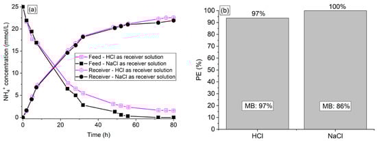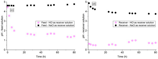 As shown in Figure 2c,d, the pH profile for the NaCl solution was the same as that presented in Section 3.1. In this case, the increase in pH of the feed solution and a pH decrease for the receiver solution occurred due to the influence of NH4+ acidity, as already discussed. When HCl was used, the effect of this phenomenon became negligible since the migration of H+ from the receiver to the feed solution was intense. In this sense, the pH of the feed decreased significantly, while the pH of the receiver increased slightly.