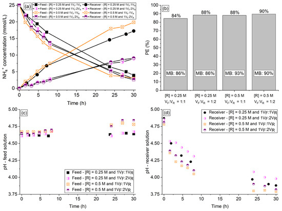 The effect of the volume ratio of feed:receiver solutions was evaluated for 30 h. The organic acids and phosphate ions remained in the feed solution. Figure 5a shows the NH4+ concentration time course in the two compartments, Figure 5b shows the NH4+ percent extraction and mass balance, and Figure 5c,d shows the pH vs. time profiles of the solutions from the tests conducted under the following conditions of receiver concentration ([R]) and volume ratio of feed:receiver solutions: (1) [R] = 0.25 M and VF:VR = 1:1; (2) [R] = 0.25 M and VF:VR = 1:2; (3) [R] = 0.5 M and VF:VR = 1:1; (4) [R] = 0.5 M and VF:VR = 1:2.