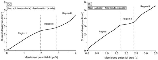 The current–voltage curves shown in Figure 6 were constructed by linear sweep voltammetry using Ralex membrane and two configurations regarding the solutions present in each compartment: (a) synthetic feed—synthetic feed, and (b) NaCl 0.25 M—synthetic feed solutions. Note that the curves presented three well-defined regions. In region I, also called the quasi-ohmic region, ion transport is governed by diffusion–migration. Region II is a transition zone between regions I and III, and the range of membrane potential drop of this region (plateau length) is related to the energy required to change the dominant ion transport mechanism from diffusion–migration to over-limiting mechanisms. In region III, over-limiting mechanisms of mass transfer, such as electroconvection, gravitational convection, and water dissociation, become dominant [20,41].