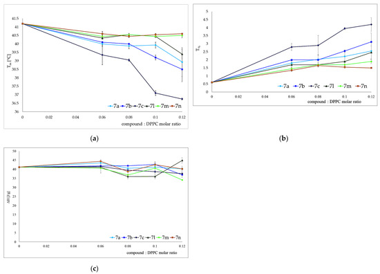 Studying the interaction of potential drugs with biological membranes is quite important due to the fact that this interaction is very often a preliminary stage before absorption in the human body. Moreover, drugs may act on the surface of the cell membrane or have intracellular targets of action. However, these processes may be very complicated, and that is why, to study these mechanisms, simplified models of membranes are used. To investigate the interaction of the studied compounds with model membranes, we used multiple bilayers made of 1,2-dipalmitoyl-sn-glycero-3-phosphatidylcholine (DPPC) in a buffer solution (pH 7.4) as a model of the phospholipid membrane. Differential scanning calorimetry (DSC) was used as measurement method. The impact of the compound 7c on the lipid thermal behavior is presented in Figure 3, showing the example thermograms of DPPC mixed with 7c in different molar ratios. This compound decreased the main phase transition temperature (Tm), and broadened the transition peaks (∆T½) the most among all tested compounds. The addition of all compounds caused the disappearance of the DPPC pretransition and concentration-dependent shift of the main transition temperature towards lower values, accompanied by a decrease in the transition peak area and the broadening of the peaks (Figure 4).