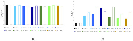 Relative main transition temperature (a) and transition peak width at half height (b) for 1,2-dipalmitoyl-sn-glycero-3-phosphatidylcholine (DPPC) and 1,2-dimyristoyl-sn-glycero-3-phosphocholine (DMPC) incorporated by compounds studied in 0.1 compound:phospholipid molar ratio.