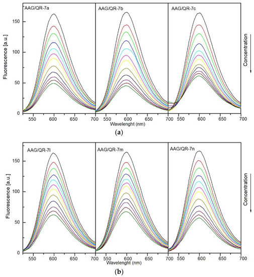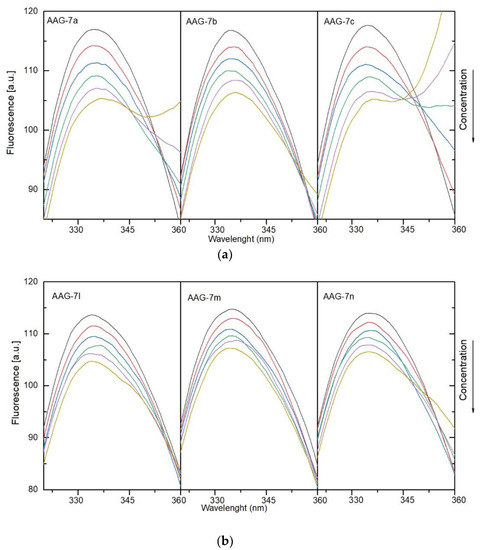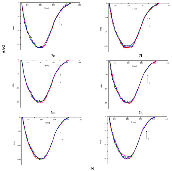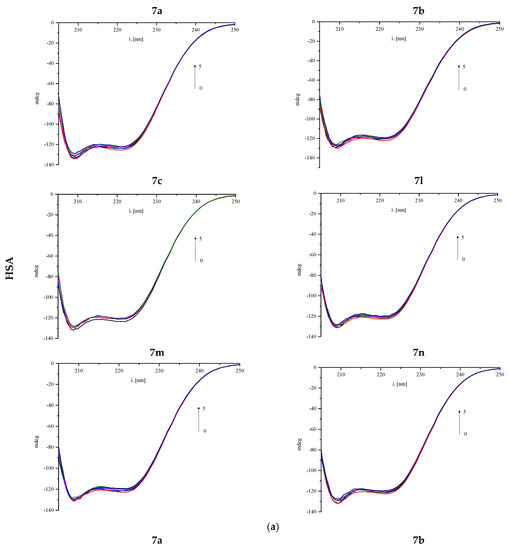 Circular dichroism (CD) spectra were measured on a Jasco J-1500 magnetic circular dichroism spectrometer (Jasco International Co., Tokyo, Japan). Human serum albumin (HSA) and α-1-acid glycoprotein (AAG) powders were purchased from Sigma Aldrich. All measurements for the protein solutions in the absence and presence of the analyzed pyrrolo[3,4-c]pyrrole analogues 7a–7n were made under simulated physiological conditions in pH 7.4 in phosphate buffer (in tablets, Sigma Aldrich) as a solvent at room temperature. The spectra were measured in the range of 205–250 nm at a scan rate of 50 nm/min, with a response time of 1 s and 10 mm path length. All of them were baseline-corrected (phosphate buffer was used as a baseline). The concentration of proteins was 1 × 10−6 mol/dm3, while for the analyzed compounds 7a–7n, the concentration was equal to 1 × 10−3 mol/dm3. Experiments were performed with protein-to-ligand molar ratios of 1:0, 1:0.5, 1:1, 1:1, 1:3, and 1:5. A solution of each protein (3 cm3) was titrated by successive additions of analyzed compounds. The analysis of obtained results was made by CD Multivariate Calibration Creation and CD Multivariate SSE programs (Jasco International Co., Tokyo, Japan), with the conversion of protein concentrations for mean residue molar concentrations.