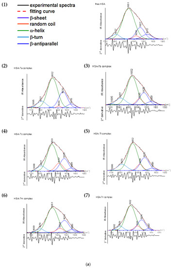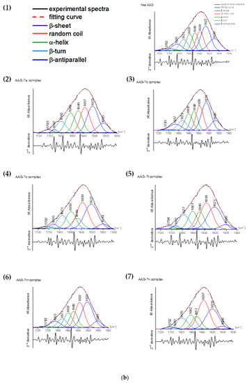 Analyses proceeded using Omnic 9.3.30 (Thermo Fisher Scientific Inc., Waltham, MA, USA) and OriginePro (OrigineLab Corporation, Northampton, MA, USA) software. The analysis of FTIR spectra was evaluated by Byler and Susi procedure [44]. After subtraction of the buffer background spectrum, the amide I peak was extracted and the second derivate made. This allowed for the selection of ingredient signals exactly related to the secondary structure. The peaks from the spectral range were responsible for shapes of α-helix (1650–1665 cm−1), β-sheet (1610–1640 cm−1), α-turn (1666–1673 cm−1), β-antiparallel (1675–1695 cm−1), and random coil (1640–1650 cm−1) were evaluated [44,45,46,47]. The fitting was conducted by Gaussian function. The self-deconvolution and curve fitting allowed us to determine the intensity and total area under peaks.