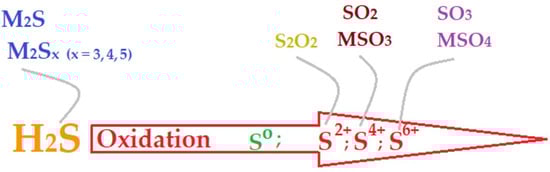 Schematic presentation of the removal, capture, and sequestration of hydrogen sulfide as metal sulfides or oxidation products: oxides, sulfites, sulfates.