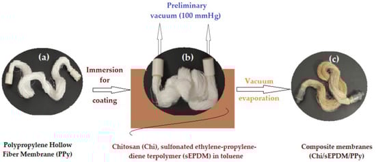 Schematic presentation of the Chi/sEPDM/PPy composite membrane production process: (a) virgin polypropylene hollow fiber membranes; (b) membranes immersed in the chitosan–sEPDM toluene dispersion bath; (c) composite membranes (Chi/sEPDM/PPy).