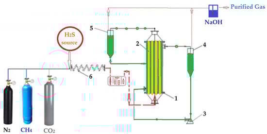 To realize the pertraction, experiments for the hydrogen sulfide sequestration from gaseous mixture were performed in installations with the tubular configuration module presented in Figure 3. The central element of the installation was the traction module (1) in which the composite membranes were fixed. Five liters of receiving solution with the required composition (pH and concentration of metal ions) was transported by the pump (3) through the outside of the membrane fibers, with a variable flow rate of 100–500 mL/min. The source phase consisting of the gaseous mixture containing hydrogen sulfide was circulated through the capillary fibers, with a flow rate of 2–20 L/min. The target gas mixtures had a matrix of nitrogen, methane, carbon dioxide (simulating domestic applications), and the target concentration of hydrogen sulfide of 20–60 ppm, but the study was extended up to 120 ppm.