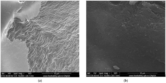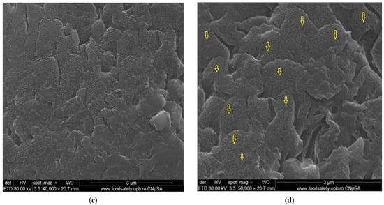 In Figure 5, attention is focused on the active membrane layer consisting of chitosan and sulfonated ethylene–propylene–diene terpolymer. Thus, the active layer presented in the left part of the image in Figure 6a (using a magnitude of 10,000×) was swept to the left, obtaining an image with a wider perspective (Figure 5b, magnitude 10,000×) that highlights the Chi/sEPDM composite surface. By careful examination of the details of the surface of the active layer of chitosan and sulfonated ethylene–propylene–diene terpolymer at the magnitude of 40,000× (Figure 5c), the surface of the composite membrane has a platelet-like (scaly) appearance, in which the continuous phase (base of the plate) is sEPDM, and the nanoparticles are made of chitosan (marked with yellow arrows—Figure 5d, magnitude 50,000×).
