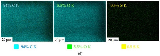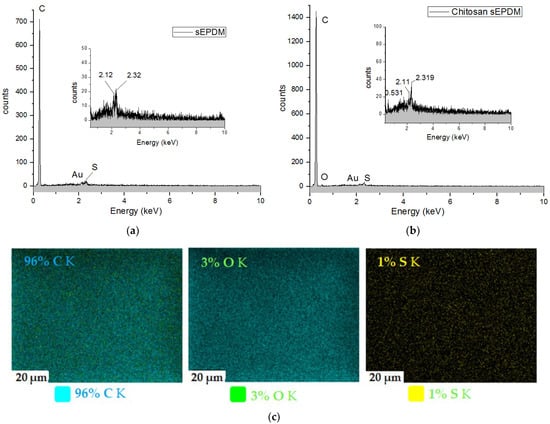 In Figure 6c,d, elemental distribution maps can be observed. The surface carbon concentration was higher in the sEPDM membrane compared to the Chi/sEPDM composite one, while the value of the oxygen concentration was reversed (the contribution of chitosan atoms being obvious). The surface concentration of sulfur was lower in the case of the composite membrane (it was reduced by half). However, given the errors in the analysis method (C error of 3.07%; O error of 29.5%, and S error of 62.31%), but also the fact that this examination was local, the results must be considered qualitative and require confirmation using alternative methods.