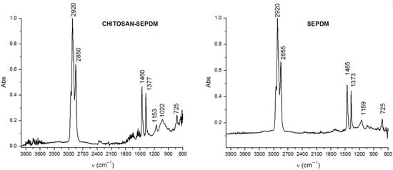 The FTIR spectrum of sEPDM (Figure 7) has specific absorption bands, due to the valence vibration of the C–H bonds located at 2855 cm−1 and 2920 cm−1; those at 1465 cm−1, where absorptions of medium intensity appear due to the vibrations of deformation of the methylene groups (–CH2−); those at 1373 cm−1, where bands of medium intensity appear due to the symmetric deformation vibration of the methyl groups (–CH3); and those with the value of 725 cm−1 due to deformation vibrations outside the plane of the C–H bonds.